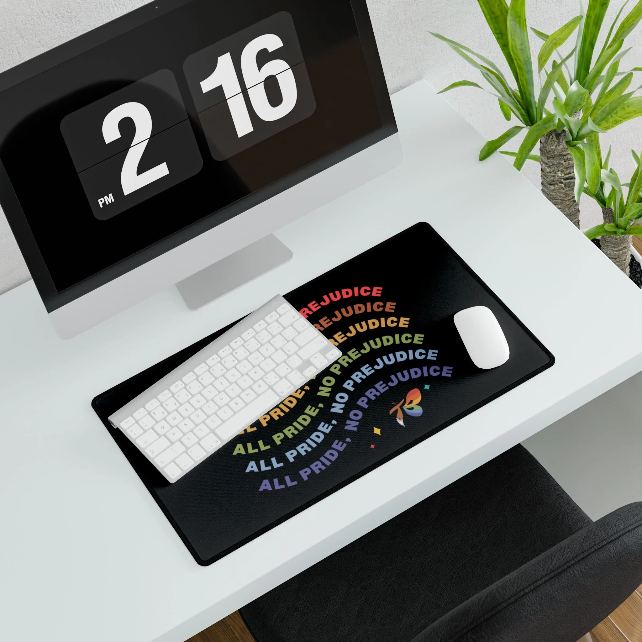 A colorful, statement-making desk mat designed to bring warmth and visibility to your workspace. The soft polyester surface showcases a repeating rainbow “ALL PRIDE. NO PREJUDICE” arc with playful sparkles and icons, set against a clean black field that makes the colors pop. Underneath, a natural rubber base grips your desk so the mat stays put through long typing sessions and frantic mouse moves. Sized to fit keyboards and mice together, this mat turns a work or gaming setup into a small space of affirmation and calm — a daily reminder of inclusion that looks lively without shouting.
